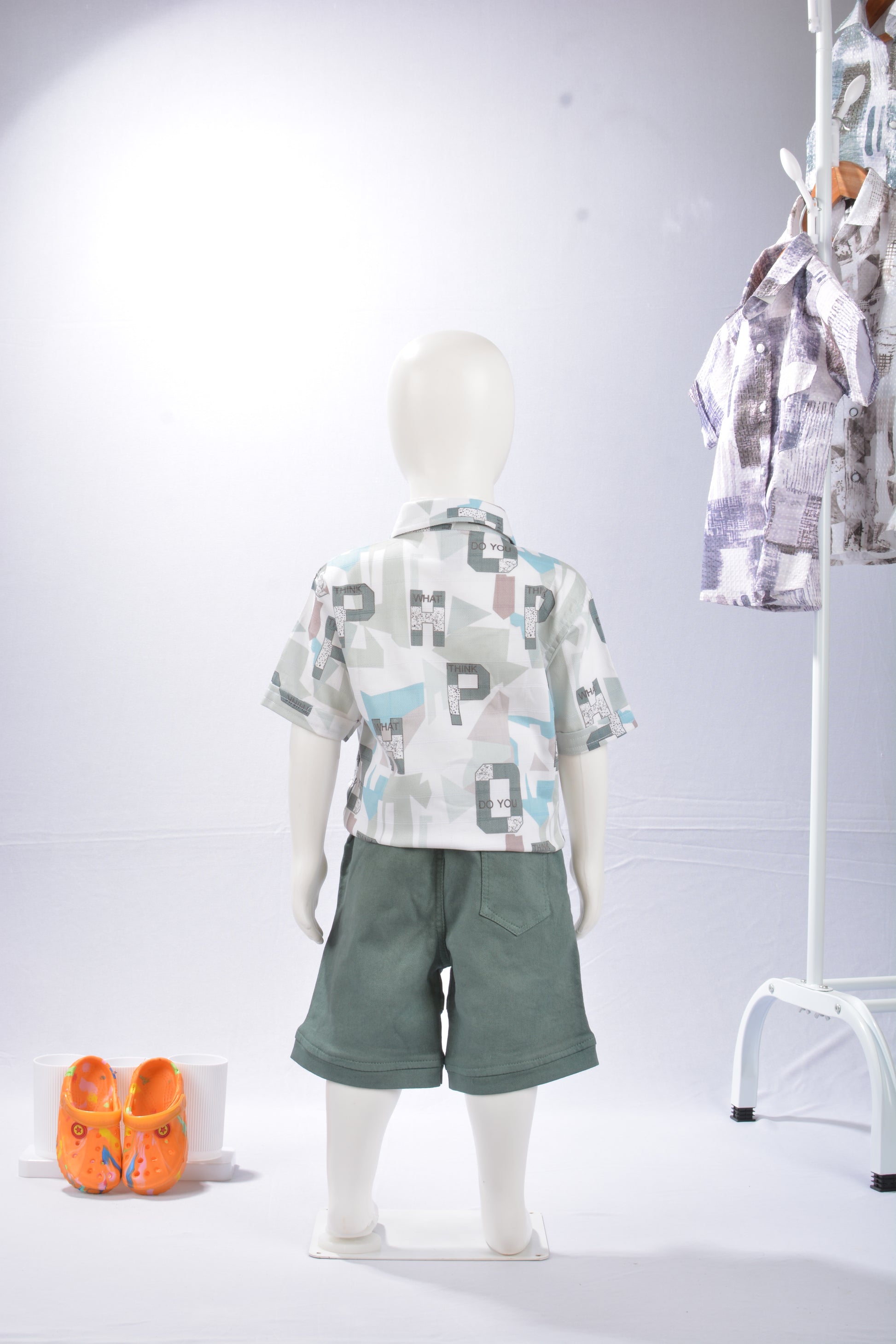 Style Statement: The standout feature is the vibrant shirt, which uses contemporary geometric shapes and unique text elements for a fashion-forward, statement-making look. Paired with the solid, utility-style green shorts, this set is incredibly versatile. Dress it up with slip-ons for a gathering or keep it casual for playtime.